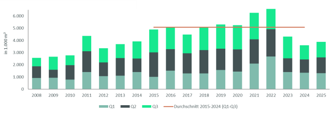 - Flächenumsatz stieg in den ersten drei Quartalen 2025 um 8,2 Prozent auf 3,88 Millionen Quadratmeter
