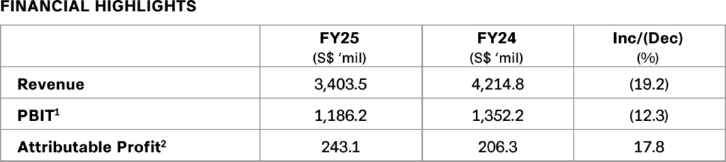 The Group’s FY25 earnings benefited from net fair value change recorded from build-to-core development completions and divestments, along with reversal of tax provisions. However, PBIT declined due to lower residential contributions across most markets, primarily due to timing of project settlements and impairments on certain projects, partly offset by strenger industrial and logistics („l&L“) and retail performance. Excluding the one-off reversal of tax provisions, attributable profit was 50% lower year-on-year, reflecting lower PBIT and higher net interest expense.