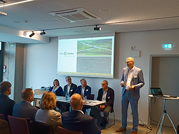 Matthias Geppert (GAUFF Engineering) präsentierte die laufenden Infrastrukturplanungen für die Straßen- und Schienenanbindung des Güterverkehrszentrums InterFranken. Dabei nahm der Planer zahlreiche Hinweise und Impulse von den anwesenden Teilnehmern für die Terminalplanung mit auf: „Ein Terminal funktioniert nur dann optimal, wenn die Praxis von Anfang an mitgedacht wird. Die heutige Diskussion liefert wertvolle Hinweise für eine moderne, leistungsfähige Terminalplanung.“