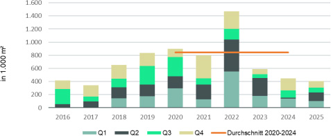- Flächenumsatz von 406.000 Quadratmetern* im Jahr 2025 – neun Prozent weniger als 2024