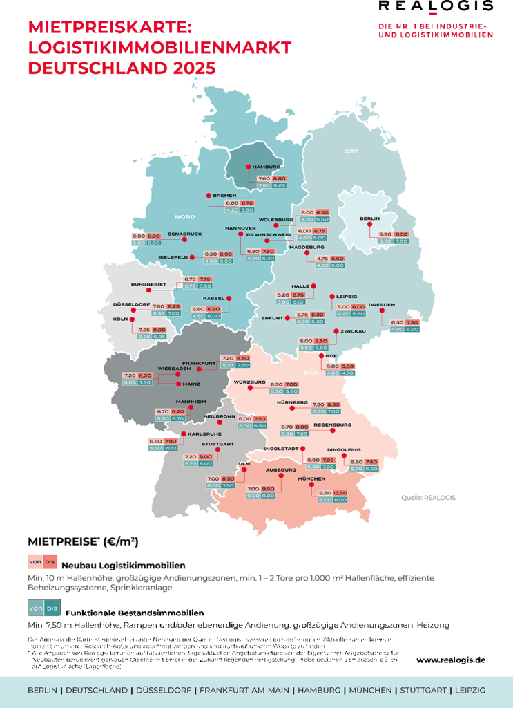 Die REALOGIS Unternehmensgruppe hat die Mietpreisentwicklung für Neubau- und Bestandsflächen in 33 deutschen Industrie- und Logistikmärkten analysiert. Die Ergebnisse zeigen für das Jahr 2025 einen moderaten, aber breit getragenen Mietanstieg. In den von REALOGIS definierten Top 8 Märkten Berlin, Hamburg, München, Frankfurt am Main, Köln, Düsseldorf, dem Ruhrgebiet und Stuttgart wurden sowohl einfache als auch hochwertige Flächen stark nachgefragt. Entsprechend stiegen Mindest- und Spitzenmieten parallel, ohne dass sich die Preisabstände deutlich veränderten. Die Marktstruktur der führenden Standorte blieb damit stabil.