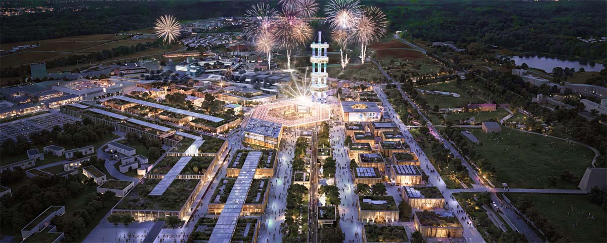 Als verbindendes Element entsteht im Entwurf die Expo Plaza im Zentrum der Weltausstellung. An sie grenzen Arena, Deutschland-Pavillon und Berlin-Pavillon, während ein filigraner Aussichtsturm mit scheinbar schwebenden Glasringen als mögliches Wahrzeichen der EXPO 2035 Berlin in Erscheinung tritt.