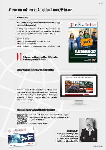 Das Magazin für Logistik & Real Estate für Entscheider und Führungskräfte. Print und digital. nimmt gern Ihre Anfragen und